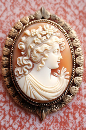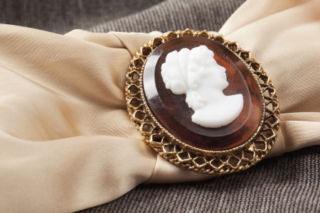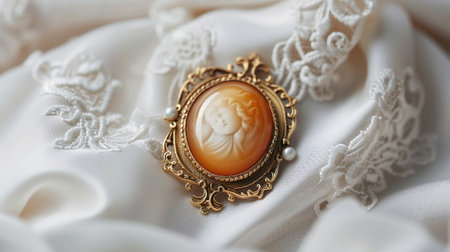 Elegant Cameo Brooch on Ornate Fabric, Vintage Jewelry Close Up.