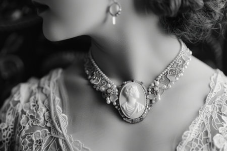 A vintage cameo necklace on a lace doily, evoking Victorian elegance and historical charm