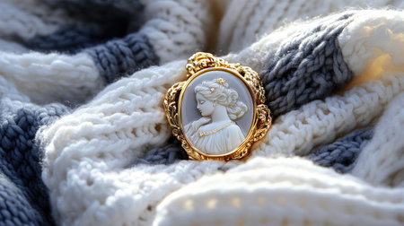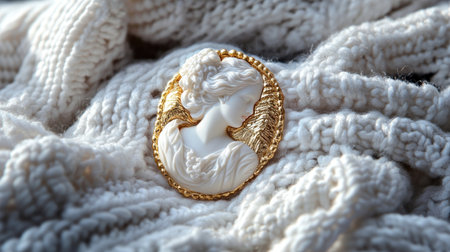 A beautifully crafted vintage cameo brooch lies gracefully on a cozy cream knitted sweater, highlighting exquisite details and timeless elegance in this stunning composition.