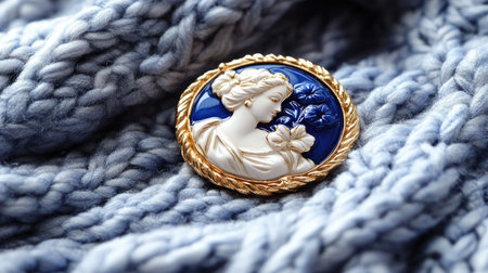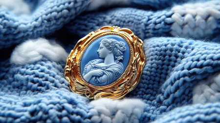 A vintage cameo brooch rests on a soft blue knitted fabric, showcasing elegant craftsmanship and intricate detailing, perfect for stylish accessories.