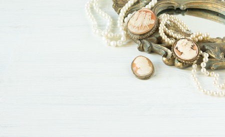 Woman's Jewelry. Vintage jewelry background. Beautiful pearl necklace, bracelet and cameo broochs on an old mirror frame. Flat lay, top view