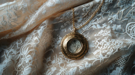 A gold necklace with an elegant locket resting on a vintage lace tablecloth.