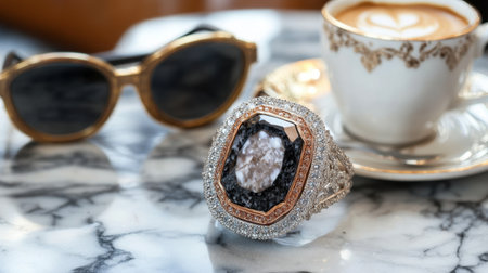 This captivating image showcases a luxurious diamond ring paired with chic sunglasses and an elegant coffee cup, creating a perfect confluence of style and sophistication on a marble tabletop.