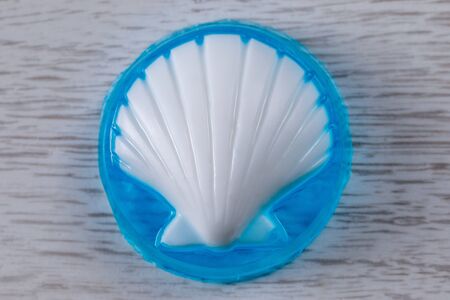 Glycerin base soap handmade with a white shell on a blue transparent base lying on the table