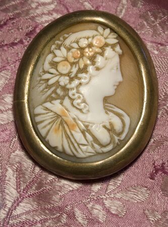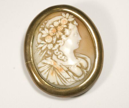 Close up of a gold pendant with the image of a beautiful girl.