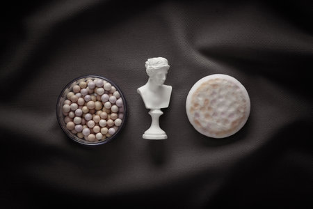Venus bust with powder balls on gray fabric background