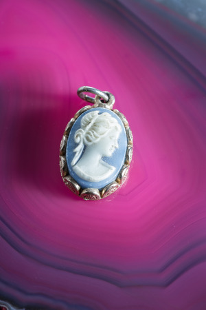 close up of a beautiful cameo on a vivid pink polished stone