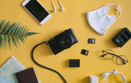 top view travel concept with camera, map, passport and disposable face mask, Tourist essentials, vintage tone effect