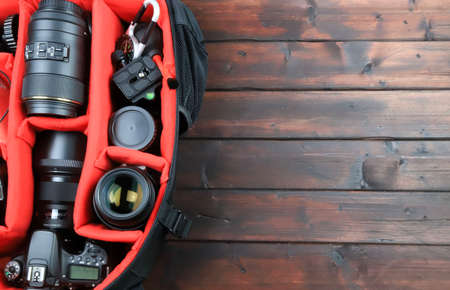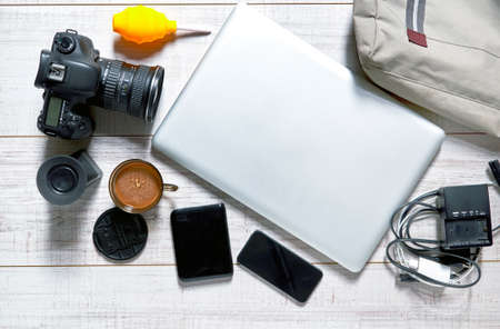 Digital time. Photo equipment. Top view of diverse personal equipment for photographer laying on the wooden grain