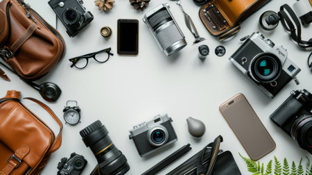 Flat lay of various photography equipment, including cameras, lenses, and accessories, neatly arranged on a white background. The image highlights the tools of the trade for photographers.