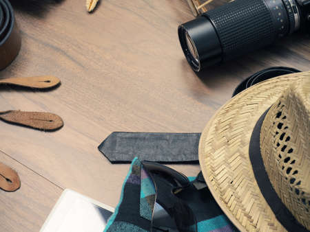 Preparation for travel,camera,hat,shoes,watch, leather bag on wooden table.