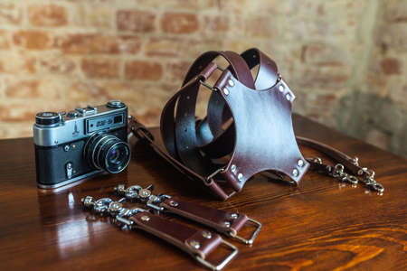 old blue jeans, vintage leather belt and ancient rangefinder camera. still life in a nostalgic manner