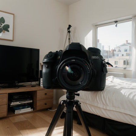 Camera on a tripod in bedroom interior Professional DSLR digital camera selective focus Horizontal orientation copy space Pho