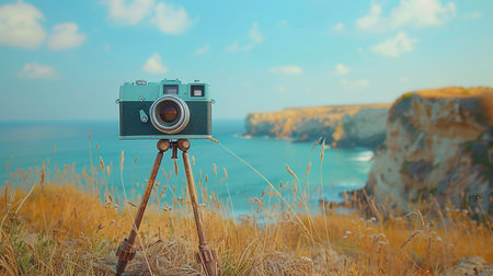 Close-up of a vintage camera on a tripod, perfectly balanced and ready for a photoshoot, with rustic tones highlighting its antique beauty.