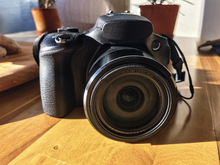 Camera lens on a wooden table. Selective focus. Shallow depth of field