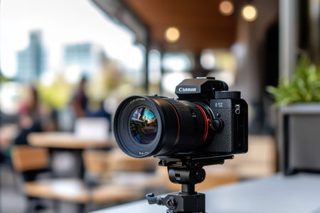 A high-quality camera is positioned on a tripod, ready to capture beautiful shots in a modern cafe.