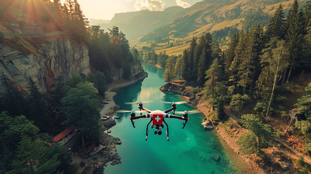 A drone with a red first aid kit flying over a mountain landscape with a green forest, a small lake, and a valley at sunset or sunrise. Mountain rescue concept.