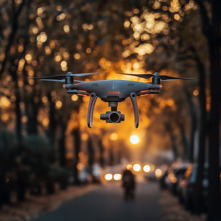Aerial view of a professional drone with propellers flying with camera and sunset sky in digital technology concept. An electronic gadget equipment. A small plane or aircraft.