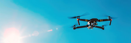 Flying drone with blue sky background controlled by professional photographer