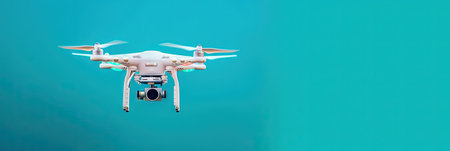 Drone quadcopter with digital camera flying over blue background.