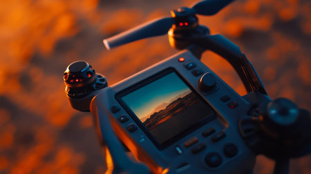 A close-up view of a drone remote control screen capturing a beautiful sunset landscape. The image showcases technology in action, highlighting the operator's perspective.