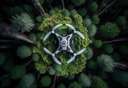 Aerial view to Modern drone flies above forest. Dark drone in air against the backdrop of landscape. Ai generative