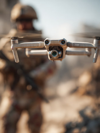 This image features a highly detailed drone with an advanced camera. The drone's intricate design showcases mechanical components, wires, and propellers, emphasizing its technological sophistication. It's pictured against a bright, blurred sky.