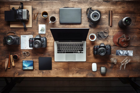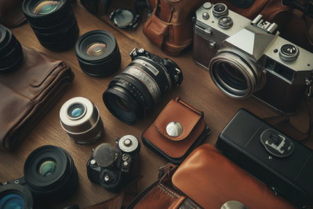This flat lay composition features an array of photography equipment including cameras, lenses, and accessories on a wooden table, perfect for creative work.