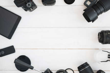 Photo equipment frame. Top view of diverse personal equipment for photographer, copy space