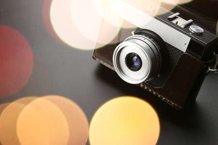 Retro film photo camera isolated on blurred background at light bokeh.