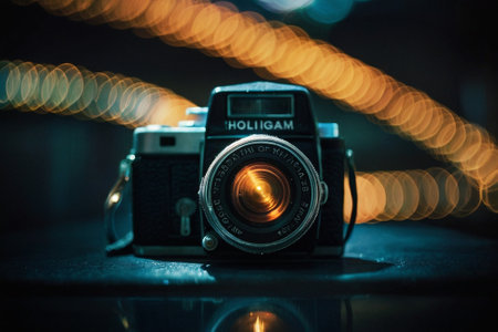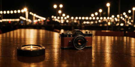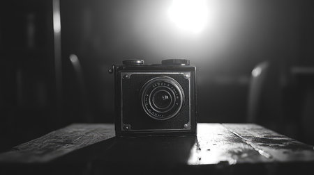 A striking vintage camera sits on a wooden table, illuminated by soft lighting, creating a nostalgic atmosphere ideal for photography lovers and retro enthusiasts.
