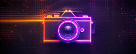 Neon outline of a retro camera on a dark grid background. Futuristic technology and photography concept