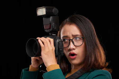 Young female photographer is shocked what content she is going to shoot