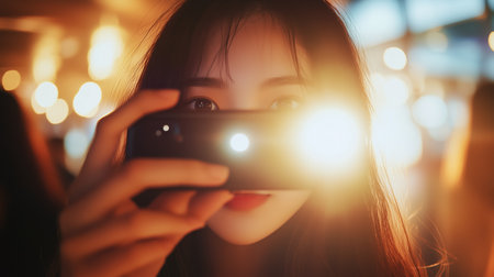 A woman takes a close-up photo with a smartphone camera in a vibrant, illuminated setting at night