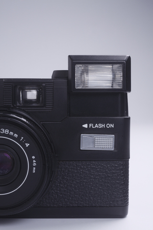Compact vintage plastic film camera with flash on dark grey jeans cloth from a high angle view