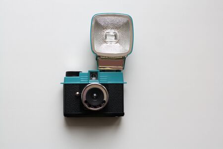 Old film photo camera on a white background. Salvador, Bahia, Brazil.