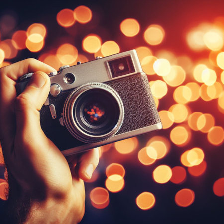 Man taking photo with retro camera on bokeh lights background.