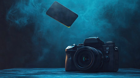 A memory card floating above a camera in a creative levitation shot with dark studio lighting