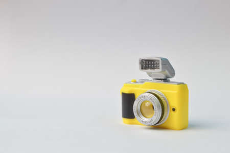 Toy camera on a yellow background. Concept. Copy space