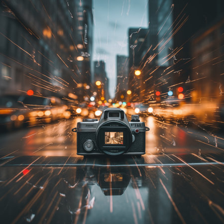 Camera resting on wet pavement reveals reflections and city lights in a street setting for creative professionals.