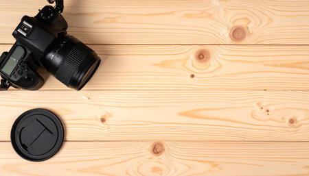 A black DSLR camera and its lens cap are placed on a light-colored wooden plank surface with visible grain.