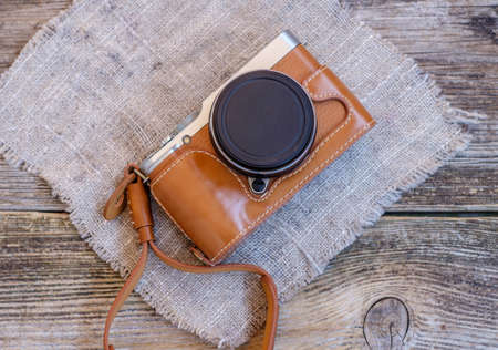 mirrorless camera in vintage style in brown leather case on a wooden table