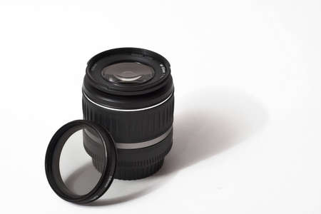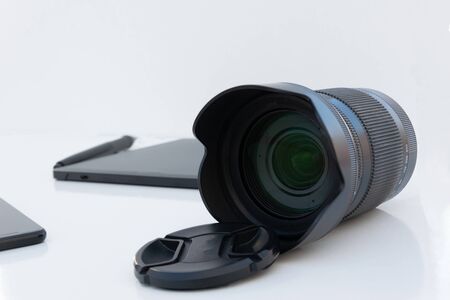 Modern digital camera lense closeup. Black camera lense. Copy space for design.