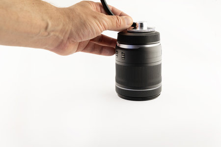 Hand Holding a Black Camera Lens Cap Isolated on White Background