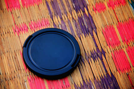 Camera Lens cap cover lying on brown suede and leather camera bag