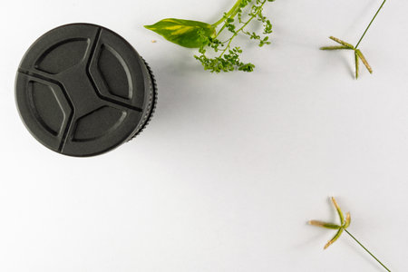 Flat lay composition featuring a black camera lens cap alongside green plants on a white surface, creating a clean and modern aesthetic.