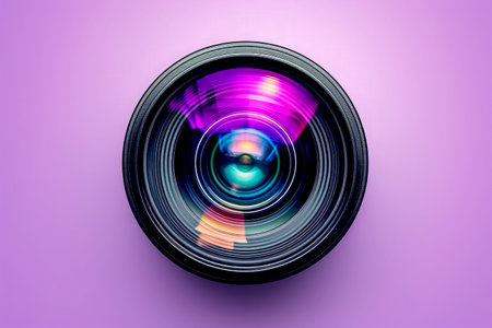 This striking close-up image of a camera lens showcases vibrant reflections and intricate patterns, perfect for photography enthusiasts and visual artists.