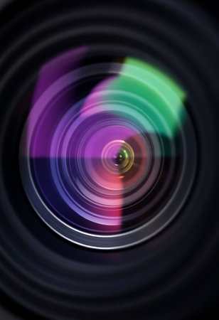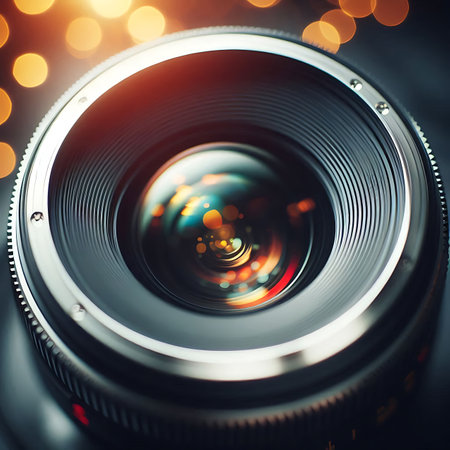 Close-up of camera lens, highlighting intricate details and reflections, capturing light and colors, illustrating the essence of photography and visual storytelling