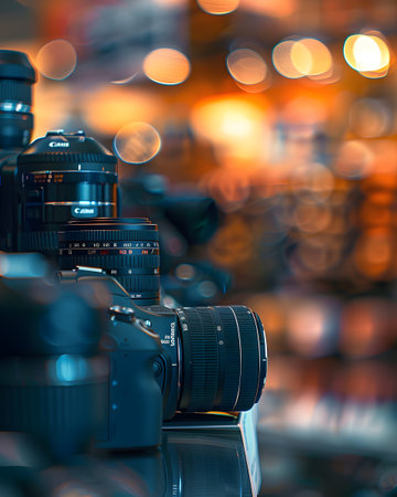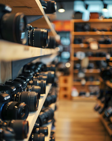 Blurry cameras and lenses in camera store shelf. Great image for your background