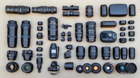This image showcases an extensive array of camera lenses and accessories, perfect for photographers seeking a variety of options for creative expressions and professional work.